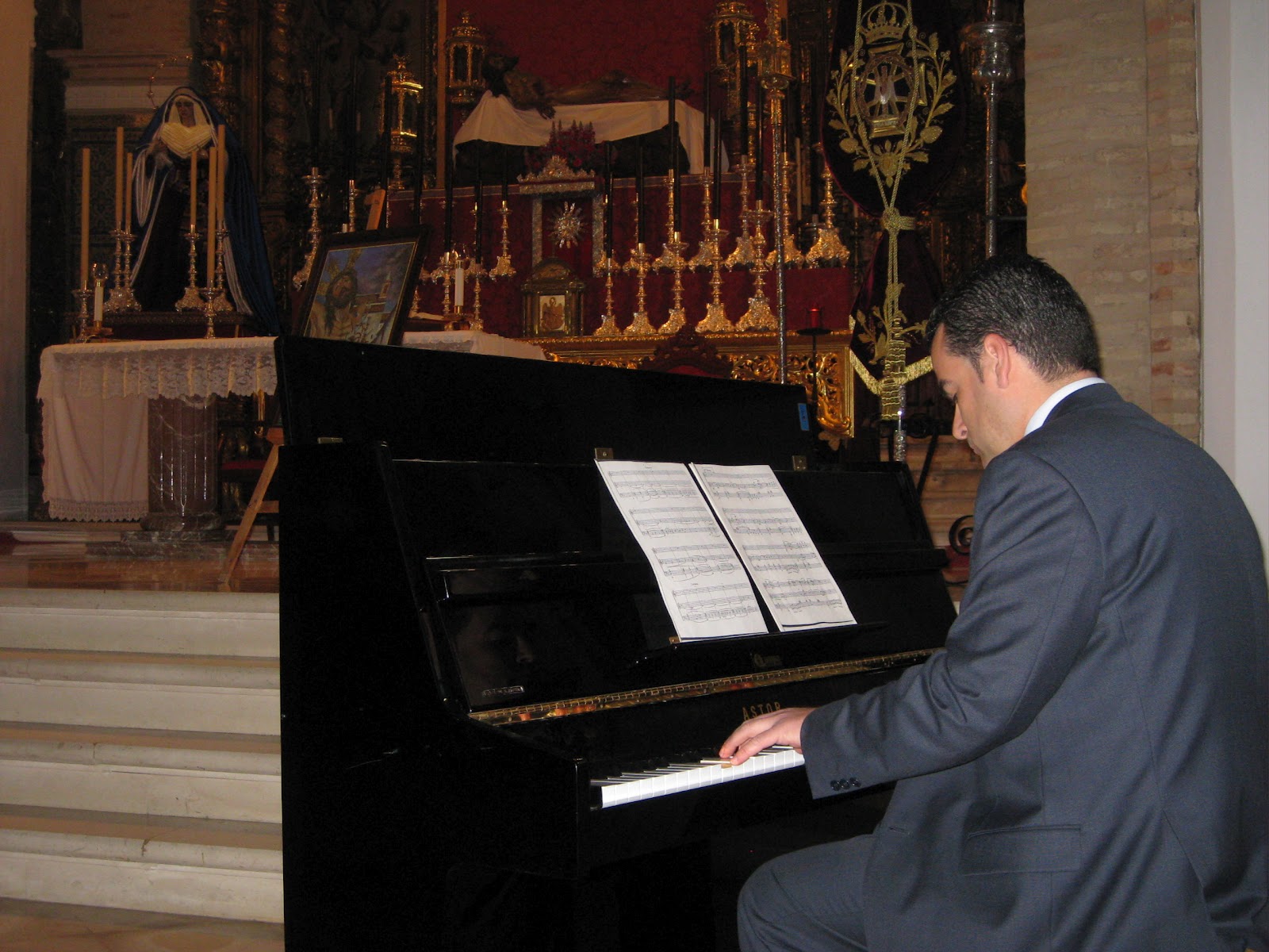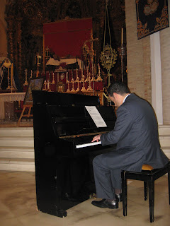 La parte musical del acto corrió a cargo de D. José Pérez Leal «El Sacri», quien interpretó un par de saetas. Por mi parte interpreté a piano varias marchas procesionales. Además, hicimos conjuntamente un tema dedicado al Cachorro de Triana. (ver vídeo más abajo).